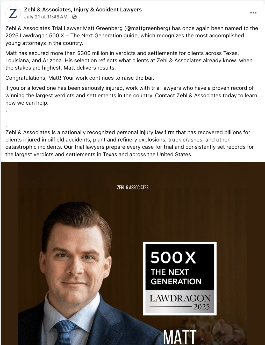 This is what Zehl & Associates does on their Facebook page when lawyers from their firm hit goals or achieve something significant.