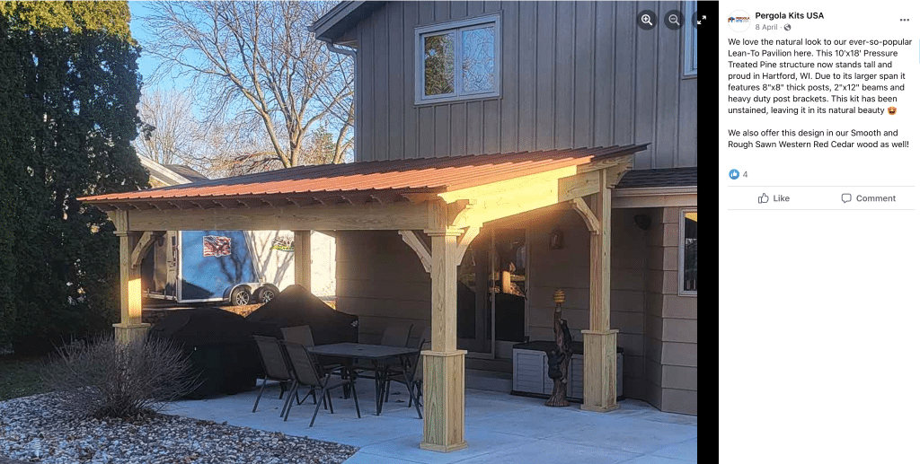 Pergola Kits USA is a great example of this tactic. Their Facebook photo captions read like a conversation with a friend. They may be showcasing some of their products and trying to get you to check them out and potentially buy them, but they do it in a very non-salesy tone. They aren’t afraid to be funny, and they sound just like someone you’d meet in real life, trying to find the best pergola kit for their home.