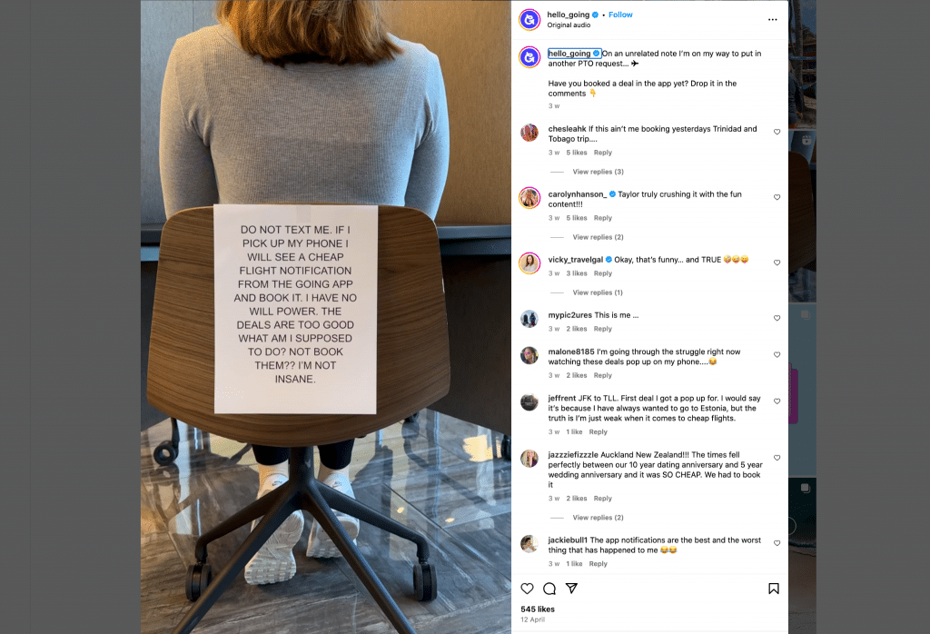Going is a great example of a brand that has found a way to connect the nature of their flight deals business with airport and travel humor. Their banter is relatable and inherently shareable, as most people will have experienced the situations they are taking the mickey out of on social media.