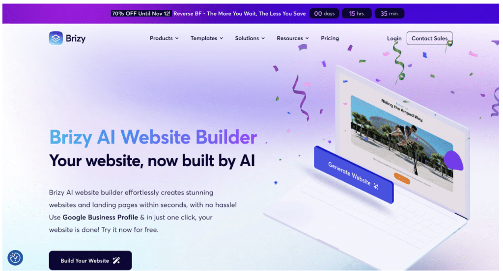 Brizy has evolved from a simple drag-and-drop builder into one of the most flexible AI-powered web creation platforms for SaaS teams. Its “generate a complete site” workflow can handle layout, content, and initial brand styling based on a short prompt describing your business. That makes it ideal for SaaS founders validating MVPs or marketing teams needing polished landing pages without a designer.
