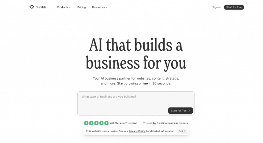 Durable is built around a single promise: launch your business site in 30 seconds. Using GPT-powered AI, it instantly creates a one-page website complete with copy, color scheme, and contact form based on a short description of your business. For early-stage SaaS startups or solo founders, it’s a frictionless way to go live fast.