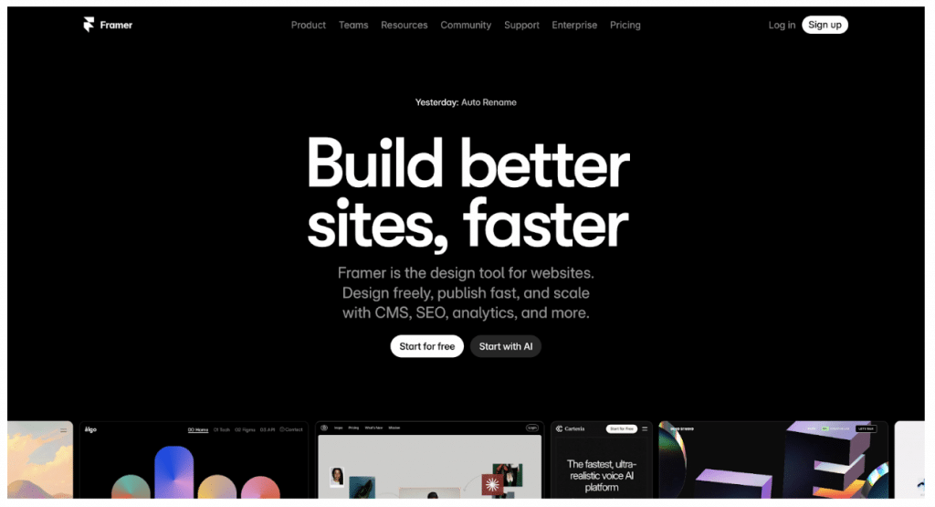 Framer started as a prototyping tool and now rivals traditional builders with its blend of AI and designer-grade flexibility. Its AI Site Generator can turn a prompt into a working website within seconds, and then designers can refine it visually with pixel-perfect precision.