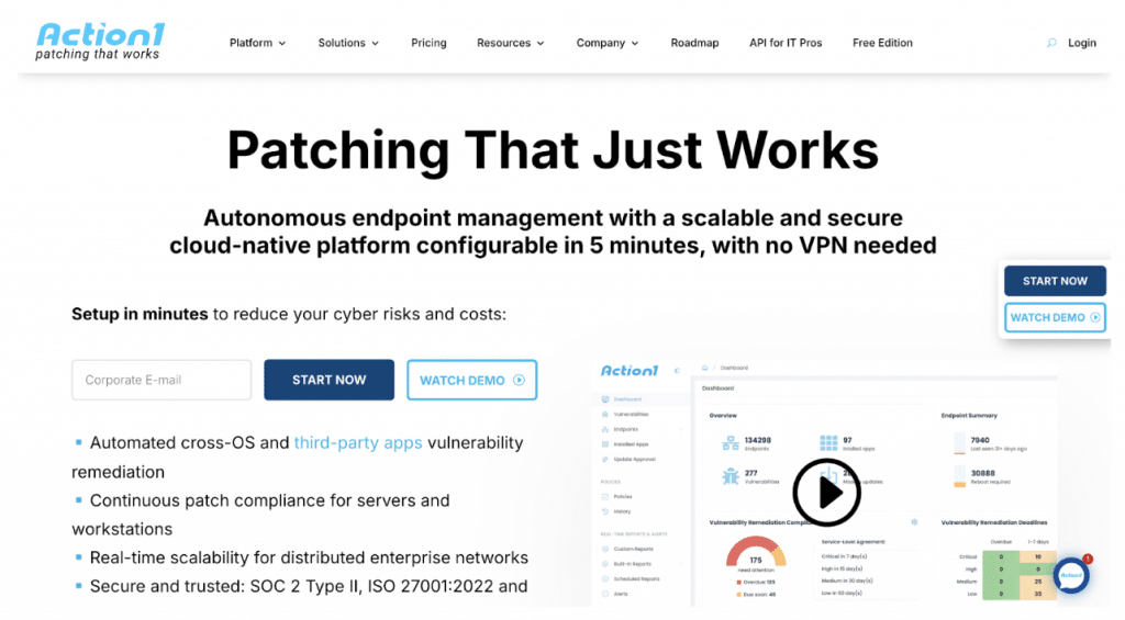 Action1 is a cloud-native patch and vulnerability-remediation platform designed for enterprises that operate remote, hybrid, or branch-heavy endpoint networks. It supports OS patches and a wide catalogue of third-party applications, offers real-time compliance status, and uses a lightweight agent model to support endpoints even when they’re not connected through VPNs.