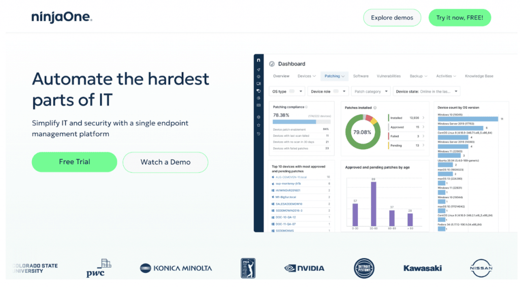 Replacing one of the earlier entries to avoid duplication within the same vendor family, NinjaOne offers a comprehensive patch-management capability bundled within a remote monitoring and management (RMM) platform. It supports Windows, macOS and Linux OS patching, automates discovery and deployment at scale, and gives teams a unified dashboard for endpoint health and compliance.