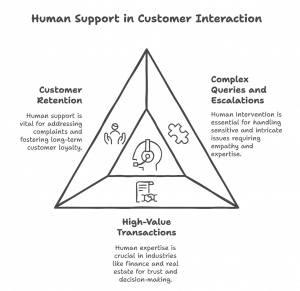 AI chatbots are great for routine and complex inquiries. But some cases need human help. Some tasks need empathy, expertise, and creativity which chatbots lack. So, human support is part of the customer interaction. Below are three key areas where human involvement remains important.