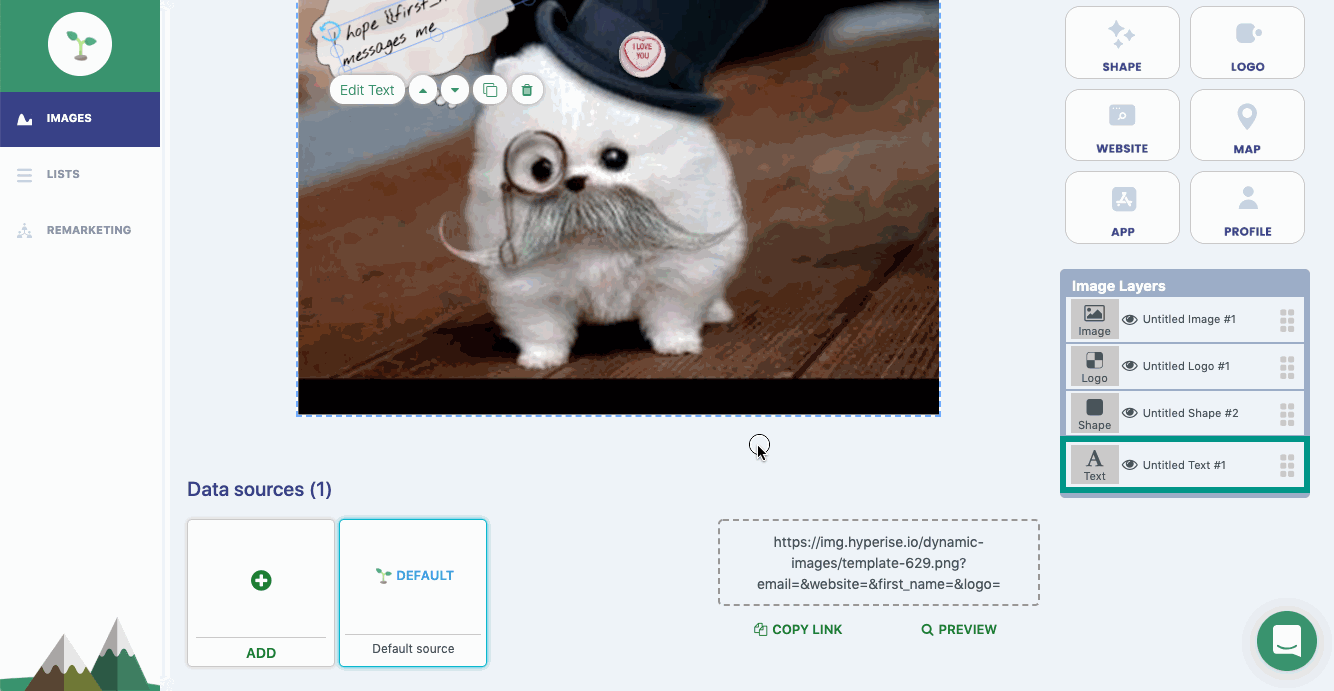In this image template we’ve added a company logo as a badge to the dogs top hat, we also set a fallback of a Love Hearts sweet, for the occasions when the prospect doesn’t have a business or logo.