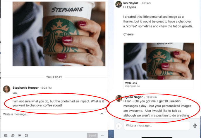 Best of all, you don’t need any coding knowledge to use our platform. Here’s what a personalized message on LinkedIn could look like when you use the Hyperise toolkit: