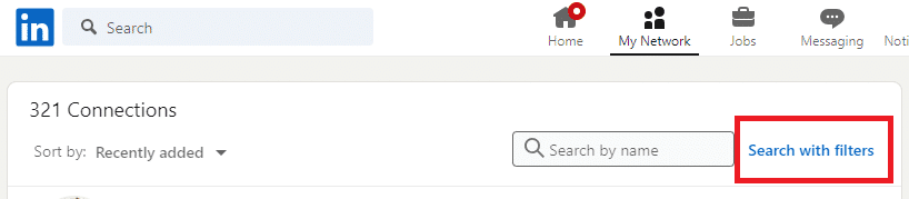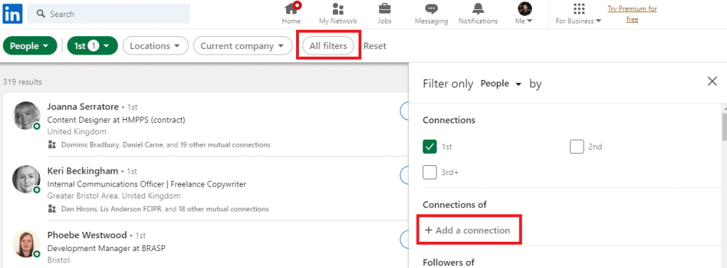 5. Click “All filters” below the search bar and choose “Connections of”.