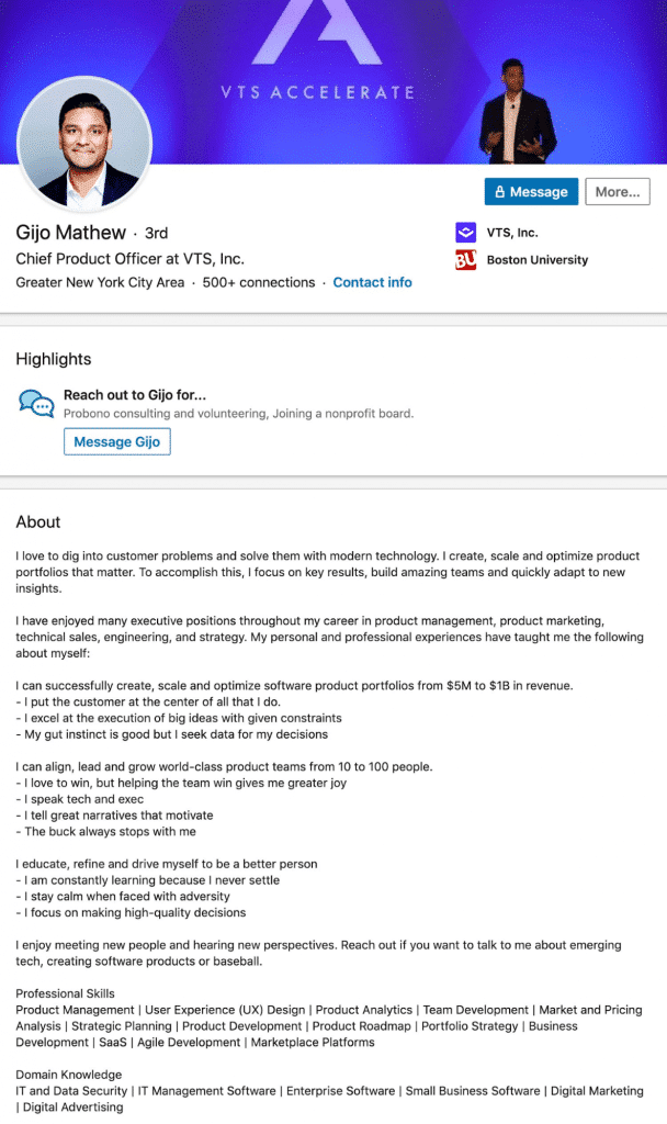 Gijo Matthew’s profile is a good example that takes all the tips provided above into account: