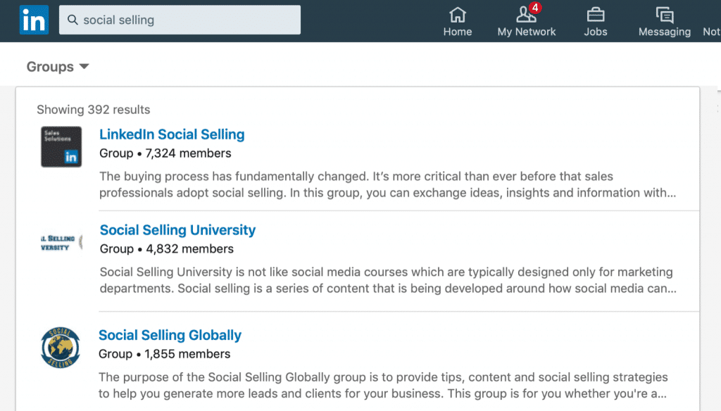 You’ll be presented with a list of groups to choose from. For example, check out what comes up when you search for “social selling”: