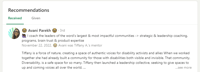 Here’s a good example from disability rights advocate, Tiffany Yu’s profile: